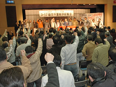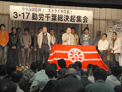 動労千葉はスト初日の3月17日、「09春闘勝利! ストライキ貫徹!」を掲げて総決起集会を開催した。