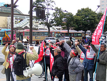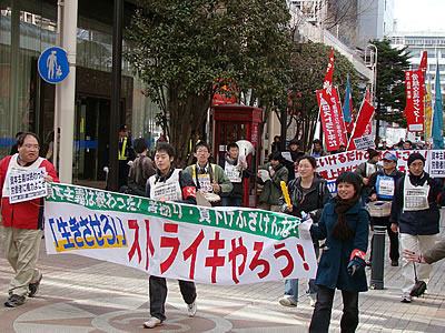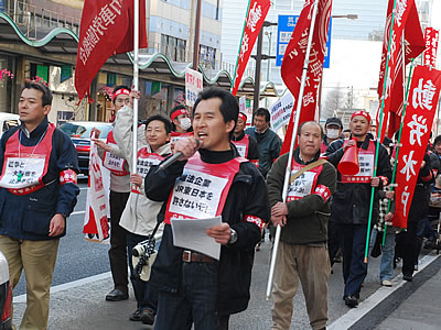 2月22日、長野市で長野労組交流センターや千曲ユニオンを中心とした「09春闘勝利! 生きさせろ!ゼネストへ ワーカーズアクションinNAGANO」を一日行動として闘いとった。長野県で唯一の労働者の団結と革命を呼びかけるデモを市中心地から長野駅前まで貫徹した。両手を突き上げてジャンプする女子高生たち、「YES!YES!」と笑顔で叫ぶ青年たちなど、注目度は抜群。