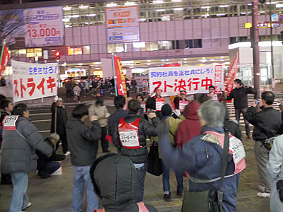 動労西日本広島支部は3月14日、岡山駅で契約社員の正社員化を要求してストライキを闘った。