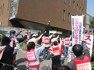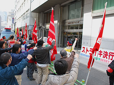(写真 集会の最後に、09春闘勝利、ストライキ貫徹、組織拡大へ向けて「団結ガンバロー」を三唱)