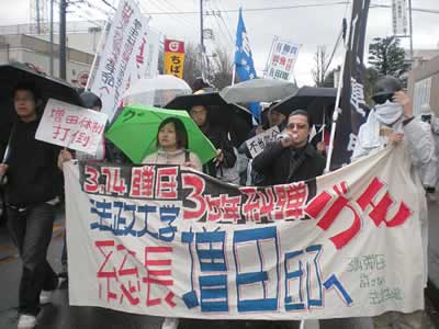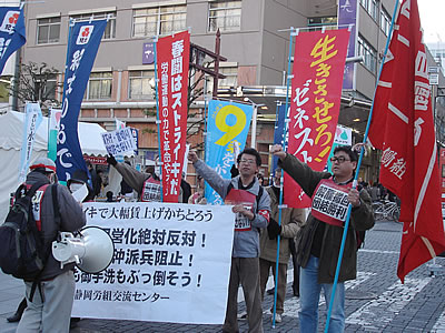 集会を終えた参加者は、水戸市内デモに出た。「春闘勝利・首切り反対」のかけ声が繁華街に響き渡った。デモの終着地はJR水戸支社前。門扉を固く閉ざすJRに対して「違法企業! 水泥棒!」と怒りの声が飛ぶ。参加者は、JRの新たな不当労働行為を打ち破る決意を込めて、怒りのシュプレヒコールをたたきつけた。