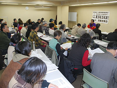 「道州制粉砕・辺野古新基地建設阻止・09春闘勝利 沖縄―本土をむすぶ労働者集会」が3月14日夕、東京・杉並で開かれた。主催は沖縄―本土をむすぶ労働組合連絡会(東京の4合同労組が加盟)と沖縄民権の会。道州制攻撃に対する反撃の陣形をつくるための討論集会としてもたれた。主催者あいさつを沖縄民権の会の座覇光子さんが、基調提起をなんぶユニオン書記長の宮里勝博さんが行った。