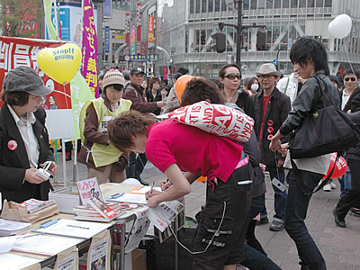 (写真 ”私も反対します” 4月5日、「裁判員制度はいらない!大運動」が山手線一斉街頭宣伝。夕方からは渋谷駅ハチ公前で4・21日比谷集会を呼びかけた。弁護士も多数参加しての訴えには大きな反響があり、青年労働者・学生らが次々と署名した)