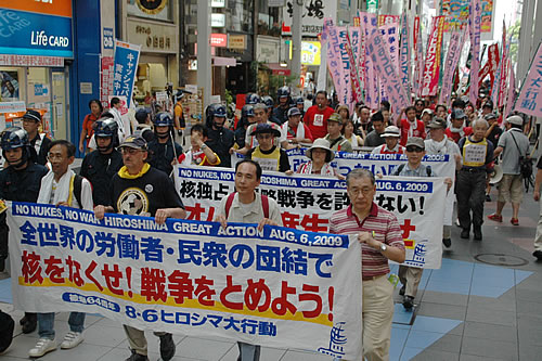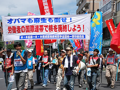 強烈な日差しと照り返しの中をデモに出発。「労働者の国際連帯で核を廃絶しよう」と大書きされた横断幕を先頭にデモは進んだ。