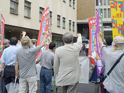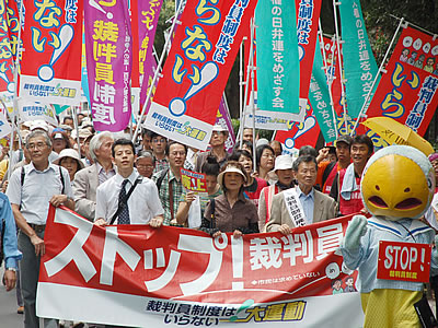 “現代の徴兵制”裁判員制度を粉砕する闘いが重大な決戦を迎えた。全国初の裁判員裁判が開始された8月3日、東京地裁は怒りの声とデモに包まれた。「裁判員制度はいらない!大運動」が呼びかけたデモに、450人の労働者・学生・市民が集まり、霞が関官庁街をデモした。労組交流センターや動労千葉、ス労自主の労働者、全学連がともに闘った。