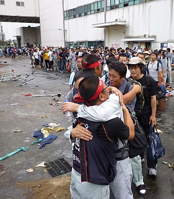 韓国・民主労総全国金属労組双龍(サンヨン)自動車支部は8月6日、資本と李明博(イミョンバク)政権との壮絶な死闘戦に勝利し、労資合意に至った。それは5月22日に整理解雇撤回・総雇用確保を要求し、平沢(ピョンテク)工場占拠の無期限ストに突入して以来、77日目のことだった。最後までハンサンギュン支部長のもと組合員の団結を守り抜き、大恐慌下の大失業攻撃と闘う労働者階級の真骨頂を示した闘いだった。この一点で偉大な勝利を歴史に刻んだサンヨン工場占拠ストは、世界の労働者を鼓舞激励し、サンヨンに続く決起を生み出している。何よりもこの日本でサンヨン闘争を引き継ぎ、11・1労働者集会1万人結集を実現しよう!