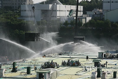 実は交渉中の31日からイミョンバク政権と資本の意を受けて警察の塗装工場鎮圧作戦が準備されていたのだ。水道・ガス、消火栓に加えて電気も止められた。大型ハシゴ車など特殊重機も投入され、警察特攻隊を含む400人が塗装工場に隣接する工場屋上へと突撃した! 国家権力の総攻勢に対して労組は、「理性を失った弾圧と暴力的侵攻を強力に弾劾する。この時間にも『一緒に生きよう』と叫ぶ560人余りの組合員らは死ぬことを覚悟して公権力に対抗し、激しい戦闘を行っている。塗装工場は火薬庫に違(たが)わない。20万g余りの引火性物質がぎっしり埋まっている。私たちは死ぬことを覚悟して最後まで戦う。大惨事が発生したならば、すべての責任はイミョンバク政権にある」と宣言した(8月4日)。