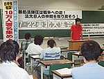 代表の田中重仁弁護士は「東京の第1回裁判ではっきりした。この制度は冤罪を増やす。裁判が簡略化され真実が発見できない。早期に制度廃止を」と訴えた。川村弁護士は「裁判員が国民の義務だと言われるが、憲法の義務は勤労・納税・教育を受けさせる、の三つだけ。裁判員制度は憲法違反」と弾劾した。