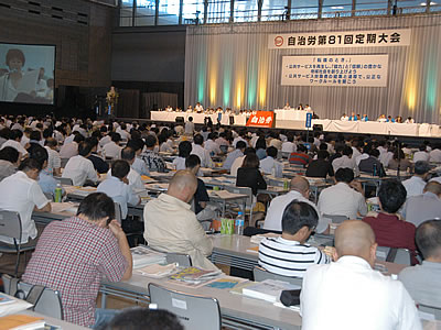 自治労本部は、岡部委員長のあいさつにもあるように今大会で完全に道州制推進の立場に踏み切った。議案には「道州制の議論に参加する」とある。道州制は公務員360万人いったん全員解雇・選別再雇用による自治労・日教組破壊、国・自治体丸ごと民営化、改憲・戦争国家化の大攻撃である。この暴露に呼応して多くの代議員が疑問と反対の声を上げた。