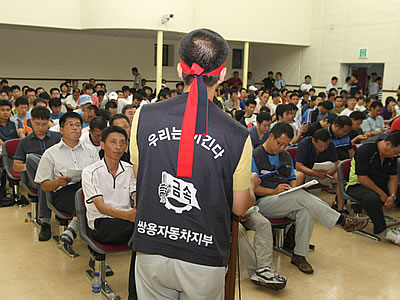 サンヨン自動車はいまだ戦争中です。さらなる生産施設破壊を防ぎ、起こり得る不幸な惨事を防止するため、大妥協を宣言し、籠城を解きましたが、会社側は徹底して裏切っています。……団体協約を完全に無視し、無慈悲な労組破壊工作にのみ血眼になっています。……