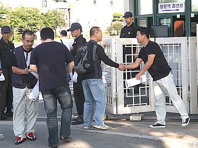 支部は9月1日、パククムソク代行を先頭に平沢(ピョンテク)工場前で宣伝戦を繰り広げ、出勤する非解雇組合員を激励した。「ご苦労さま、久しぶり」と声をかけ、握手し、「外で活動する労組が一日も早く(工場内に)戻り、活動できるように協力してほしい」と呼びかけた。