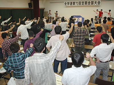 (写真 法大決戦勝利へ 全学連大会開く 9月10日から3日間、全学連第70回定期全国大会が東京・文京区民センターで開かれた。獄中の8人の学友の奪還を固く誓い、10・11三里塚闘争から11・1労働者集会1万人決起の展望を明らかにし、今秋の法大決戦総決起への臨時執行体制を確立した=詳報次号)