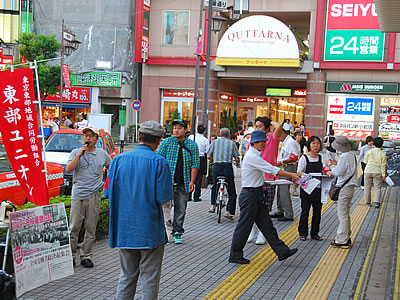 ここでも国鉄闘争への関心は高く、家族に元国労の労働者がいて国鉄分割・民営化時の苦労を聞いているという30代の女性の教育労働者が11月集会賛同署名に応じてチケットも購入、集会参加を確約した。キオスクに勤めていた30代の女性労働者はJR資本に怒っており、「尼崎事故は許せない」とチケットを購入。さらに「インド洋の給油反対」や「法大弾圧不当」と記入した女性もいた。派遣労働をやって学資をためた大学1年生は、裁判員制度は違憲だと思うと表明、マルクスを読んでみたいという話になり、いっしょに学習会をやることになった。