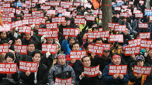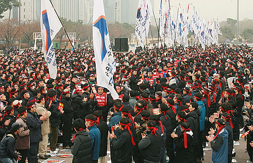 民主労総はイミョンバク政権の労組抹殺攻撃と闘う本格的な対政府闘争に入った。8日には、ソウル市ヨイドにある国会前で「密室野合糾弾、民主労組死守、イミョンバク政権退陣決意大会」を開いた後、指導部がヨイド文化広場でテント座り込み闘争に突入した。