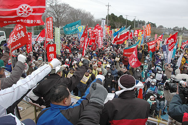3月28日、三里塚芝山連合空港反対同盟主催の全国総決起集会が成田市天神峰の市東孝雄さんの畑を会場に開催された。真冬並みの寒風が吹きすさぶ中、全国から1530人の労働者・農民・学生・市民が団結街道廃道化攻撃への怒りを燃えたぎらせて駆けつけた。