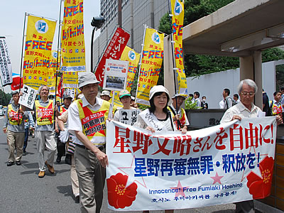 総会に先立ち25日午前、東京高裁第11刑事部に対する申し入れを行い、昼には東京高裁を包囲するデモに決起した。星野暁子さん、全国連絡会議共同代表の平良修さんを始め、全国から結集した星野さんを救う会、取り戻す会など120人が高裁横ではひときわ声を高めて拳を裁判所に突きつけ、弾劾のシュプレヒコールを繰り返した。