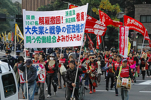 (写真 昨年を上回る隊列で11・7全国労働者集会に結集し、都心をデモ行進する動労千葉)