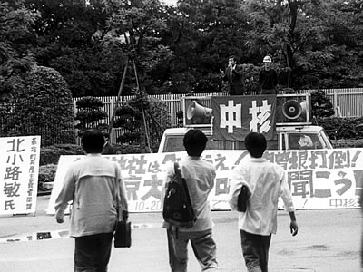 続いて中島宏明君だ。中島君は、弾圧の背景に大学の新自由主義的変質があることを全面的に暴露した。「95年の日経連報告と一体で大学の変質は進んだ。学生を物言わず働く労働力商品にするために、学生自治の破壊が進んだ」「また、大学自体が金もうけの手段となった。学生食堂は大学理事が役員を務める会社が経営し、図書館は紀伊国屋、売店はセブンイレブンと、企業が群がっている。当局は、金もうけの邪魔になる学生自治を憎んでいる」「しかし、弾圧をのりこえて闘いは引き継がれ、1年生が立ち上がっていることを誇りに思う」と結んだ。