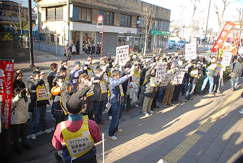 1月27、28日に東京・九段会館で行われた自治労第141回中央委員会に際して全国労組交流センター自治体労働者部会は情宣行動に立った。大恐慌と朝鮮侵略戦争情勢の中で国鉄全国運動を基軸に解雇撤回・外注化阻止を貫く階級的労働運動を推進し、侵略戦争を内乱に転化しようと呼びかけた。特に菅民主党政権とそれを支える自治労本部打倒、360万人首切りの公務員制度改革粉砕、幼保一体化の新システム阻止、「新成長戦略」推進の「持続可能な日本社会のグランドデザイン構想」粉砕を強力に訴えた。新自由主義攻撃を小泉自公政権以上に激化させる以外に延命策を持たない菅政権は凶暴だがぐらぐらだ。菅民主党政権打倒こそ11春闘方針だとアピールした。