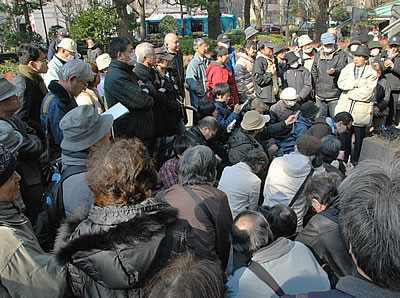 (写真 結審強行と裁判長の逃亡を徹底弾劾し総括集会が開かれた。北原事務局長が現地闘争への決起を熱烈にアピールした【2月4日 日比谷公園】)