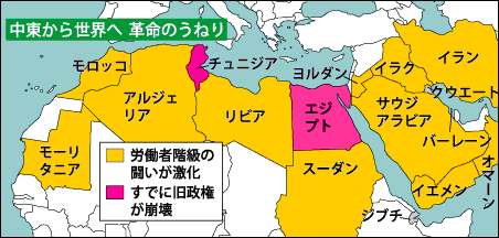(地図 中東から世界へ 革命のうねり。北アフリカ、労働者階級の闘いいが激化する国、すでに旧政権が崩壊した国)