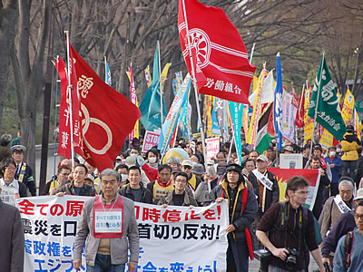 ▼ワシントンポスト電子版 日曜日、1千人と思われる人々が東京・代々木公園のオリンピック・スタジアム近くに集まり、「全原発を停止せよ!」と一斉に叫びながら渋谷のショッピング街の中心に向かって行進した。災害で崩壊した仙台から来た斎藤貴広さん(28)は、活動家たちからガソリンを寄付してもらってデモに参加するために南へ旅をしてきた。彼は「政府の救援はあまりにも遅れており、民間が補給物資を運ぼうとしても、自衛隊が救急職員以外主要道路と高速道路を通さないため、できない」と言った。