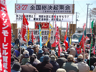 (写真 3・27三里塚「全力で被災地支援を」 反対同盟は被災地の労働者・農民・漁民と心をひとつにして「全原発の即時停止」「第3誘導路粉砕」を訴えた。演壇上は基調報告を行う萩原進事務局次長=記事5面)