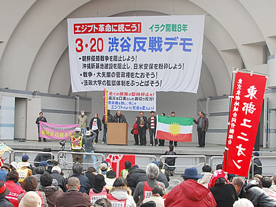 (写真 3・20渋谷反戦大集会で被災地から闘いを報告する石田君)