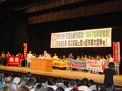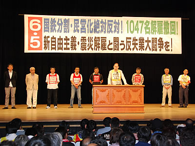 6月5日、国鉄闘争全国運動の主催で「国鉄分割・民営化絶対反対!1047名解雇撤回!新自由主義・震災解雇と闘う反失業大闘争を!6・5大集会」が東京・日比谷公会堂で開かれ、全国から1780人が大結集した。大震災と原発事故のただ中で、労働者階級人民の生き抜く道は階級的労働運動を復権させることだ。集会は国鉄決戦と反原発闘争に総決起することを誓い合った。(次号に続報)
