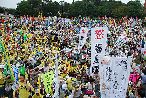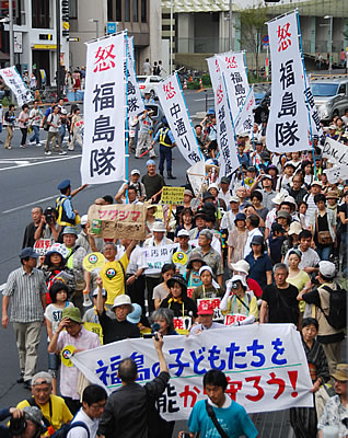 この日の闘いの大高揚をつくりだしたものは、何よりも1千人で大挙、福島から参加した人びとの怒りである。「怒」と記されたのぼり旗を掲げ、政府・東電への激しい抗議の意志をたたきつけていた。そして全国の闘う労働者は、自治労・日教組を始め、体制内労組指導部の動員抑制にもかかわらず、それを大きく突き破る組合員の決起をつくり出した。