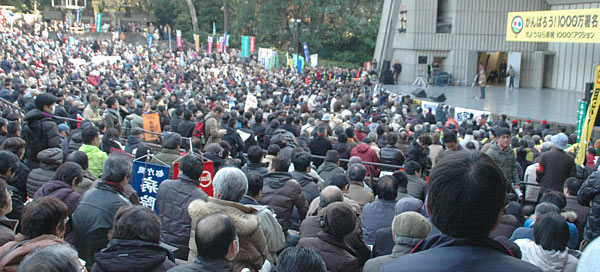 12月10日、東京・日比谷野外音楽堂で作家の大江健三郎さんらが呼びかけた「がんばろう!さようなら原発1000万署名」集会が開催された。野田政権は直前の6日、衆院で原発輸出協定の採決を強行したばかりか、福島の自主避難者に一律同額で問題にもならない低額の賠償を行うと決定した。集会は福島の声を踏みにじる暴挙への怒りで覆われ、5500人を超える参加者は明治公園での9・19反原発6万人集会の高揚を引き継ぎ、原発再稼働阻止、全原発廃炉への決意を一層固めた。