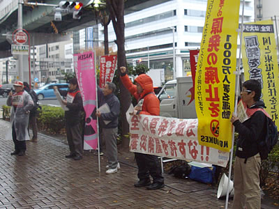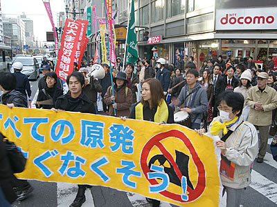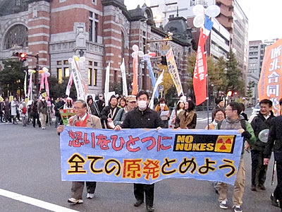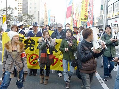 集会後、参加者はデモにうって出た。まずは日比谷公園から数百b地点の東電本店前へ。警察は路上に大型車両2台を並べ守りに必死だ。デモ隊は怒りを倍加させシュプレヒコールを次々とたたきつけた。NAZENの太鼓のリズムと青年・学生の明るく力強いコールが響き渡り、終始全体を奮い立たせリードし、隊列は倍増して500人までふくれあがった。自治労や日教組、全国一般などの労組旗が林立し師走の銀座を行き交う人びとの注目を集めた。