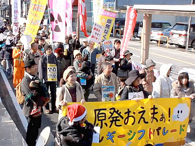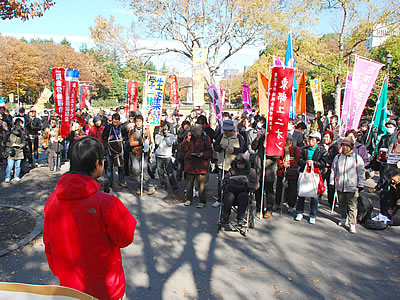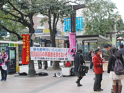南相馬市在住の福島県平和フォーラム代表の竹中柳一さん(福島県教組委員長)は、「東電は田畑に落ちた放射性物質はその土地のものだと言った。原子力安全委員会、原子力保安院は誰一人首になっていない」と憤り、「これを変えない限り子どもたちに未来はない。日本を変えていこう」と呼びかけた。そして、来年3月11日に郡山市の開成山球場で福島県民集会を開催すると告げると参加者はわれるような拍手で応えた。