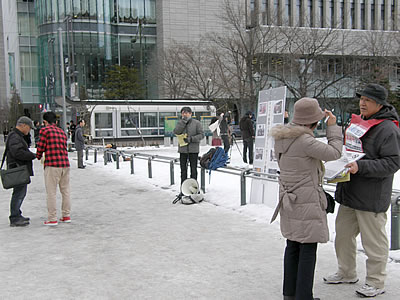 正午からの仙台市役所前街宣でも反応は上々。350枚のビラを労働者、市民が次々と受け取っていく。何人もの人が「畑文雄って悪いやつだよ」と話すなど、地域では悪名高い人物であることを再確認。
