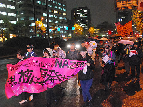 (写真 「再稼働とめて全部廃炉だ!」。降りしきる雨をものともせず国会デモに立つNAZENの隊列【4月11日 東京・霞が関】)