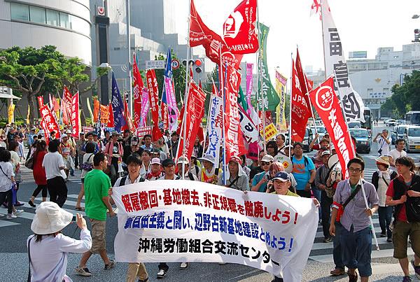 5月12日、那覇市内で臨時拡大全国運営委員会をかちとった全国労組交流センターの労働者、南部戦跡を巡った青年労働者、国際通りで街頭宣伝を行った全学連などが沖縄県庁前に結集し、国際通りデモに打って出た。労働組合旗やのぼりが林立し、「怒・福島隊」の大のぼりが目立つ。