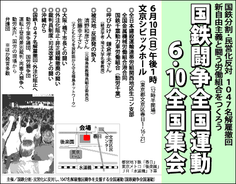 今こそ国鉄分割・民営化に革命的決着をつけよう。闘う国鉄労働運動の復権を6・10大集会からつくり出そう。6・10には国労から大結集し、国労の階級的再生をかけて代議員選挙―7月国労大会決戦に突入しよう!