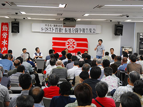 (写真 弁護士会館で開かれた「スト貫徹!仮処分闘争報告集会」には250人)