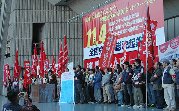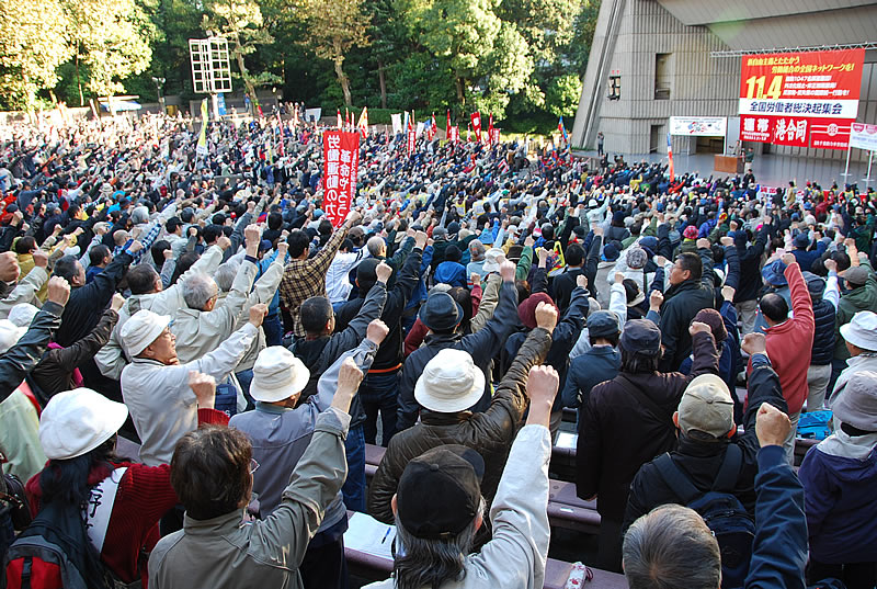 11月4日、東京・日比谷野外音楽堂で全国労働者総決起集会が5800人の大結集で意気高くかちとられた。動労千葉、全日建運輸連帯労組関西地区生コン支部、全国金属機械労組港合同の呼びかけ3労組を先頭に、全国から闘う労働者・労働組合が大結集した。また韓・米・独と、滞日外国人労働者が多数参加し、大恐慌、新自由主義と対決する国際的な労働者大会となった。「闘うわれわれこそが労働運動の主流派にならなければならない!」という使命感、「労働者が団結すれば、必ず資本家を倒し、新しい社会を建設できる」という確信と希望・展望がみなぎる歴史的な集会となった。(続報次号)