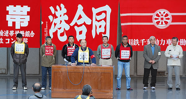 続いて動労千葉幕張支部の山田護支部長、動労千葉青年部と動労水戸の青年労働者、国労郡山工場支部の橋本光一さん、動労千葉争議団の中村仁さん、国労闘争団の羽廣憲さん、動労千葉顧問弁護団長の葉山岳夫さん、国鉄闘争全国運動呼びかけ人の伊藤晃さんが、それぞれの立場から外注化・非正規職化阻止、国鉄1047名解雇撤回へ闘う熱い決意を述べた。