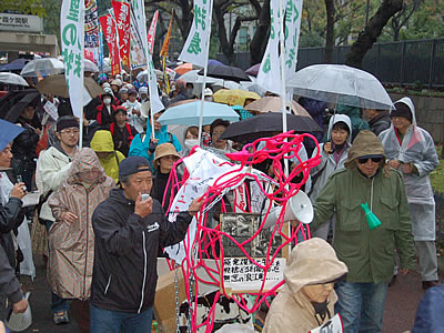 11月中旬に最高裁は全国約30万人の来年度の裁判員候補者に「名簿に載せた」という通知を出そうとしている。これはまさに「現代の赤紙(召集令状)」だ。絶対に許せない。私たちの「裁判員制度絶対反対!」「呼び出し状を送るな!」の声を最高裁にぶつけようと、この日のデモが闘われた。