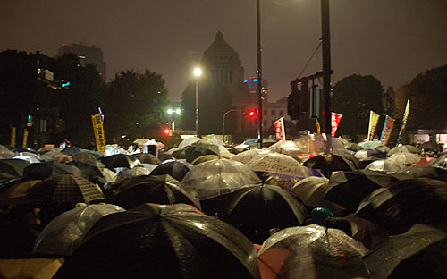 (写真 5時過ぎに国会前に大集合した参加者。激しい雨を吹き飛ばし、「再稼働反対! 原発いらない! フクシマ返せ! 大飯を止めろ!」などのコールを2時間にわたり永田町に響き渡らせた)