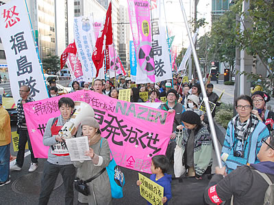 隊列は経産省前―文科省前―外務省前―農水省前―国会前のコースを堂々と進んだ。経産省前や外務省前、農水省前では猛烈な抗議の声をたたきつけた。農水省前では福島県浪江町の酪農家が「餓死してミイラ化した牛の姿を目の当たりにした。この悲しみがわかるか!」と政府と農水省を激しく弾劾し、「浪江町の無念、避難民の無念を晴らさなければならない。残りの人生をかけて原発をなくす!」と全身を震わせて発言した。