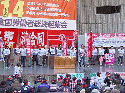 反原発の現場からも発言があり、核燃と基地が集中する青森での反原発・反基地八戸集会と三沢基地抗議行動、大間原発絶対反対の闘いが報告されました。福島・沖縄を貫き、労働者が軸となり基地と原発を廃絶する展望を示す闘いの報告は耳目を集めました。