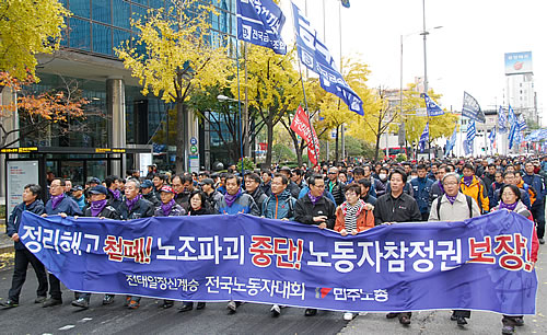 11月11日午後2時、ソウル清渓川(チョンゲチョン)の平和市場前に労働組合の旗を押し立てて労働者が続々と結集してきた。あたり一帯が労組隊列で埋まっていく。チョンテイルの銅像も労働者の人波の中だ。ソウル駅前に向かってデモが出発した。先頭の横断幕に記されたスローガンは、「整理解雇撤廃! 労組破壊中断! 労働者参政権保障!」だ。金属労組の力強い大部隊が先頭を行く。