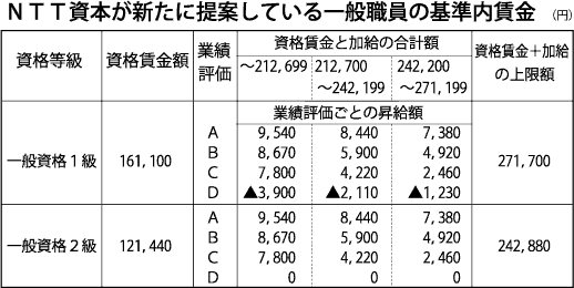 上の表はNTTグループ主要8社の一般職員の基準内賃金(基本給)額。子会社ではさらに減額が予想される。