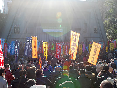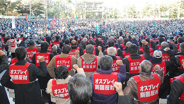 全国労組交流センターは、沖縄民権の会(8面にビラ転載)とともに日比谷野音に駆けつけ、「安倍政権を打倒してオスプレイ配備を撤回させよう」と呼びかけるビラをまき、2・17国鉄集会、反原発3・11福島現地闘争への参加を訴えた。三里塚現闘と全学連行動隊は市東さんの農地取り上げに反対する署名と新パンフレット『農地は私たちの命』を販売し、大きな反響を得た。