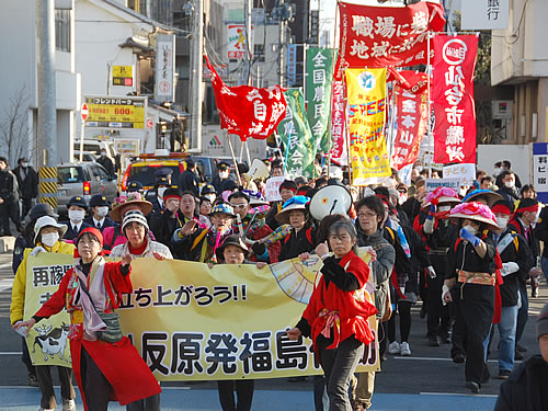 先頭は佐藤さん、椎名さんを始めとした女性・学生たちのかんしょ踊りの隊列。福島県庁前を通り、福島市の繁華街を進むデモはどこでも市民の注目を浴びた。ビルの窓から両手を大きく振る人があり、病院前では白衣の看護師たち7〜8人が手を振って声援。ある看護師は「胸がいっぱいです」と胸に手を当てた。