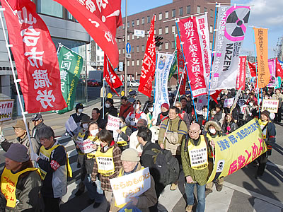 2時46分、地震発生時に合わせ、震災・原発事故とその関連で亡くなった人びとに黙祷(もくとう)をささげた。津波にのまれた人、福島第一原発で命を落とした原発労働者、「原発さえなければ」と自死に追い込まれた酪農家、仮設住宅で亡くなったお年寄り。大震災・原発事故とこの2年で、新自由主義と原発政策により実に2万人を超える労働者民衆が殺された。「原発を絶対になくす。この理不尽な社会を根本から変える」――全員が思いを強くした。