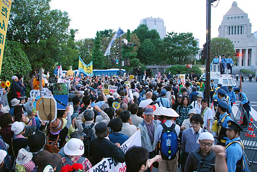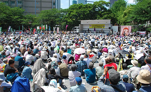 6月2日、昼から東京・芝公園と明治公園において、安倍政権の原発推進、再稼働と輸出を絶対に許さない集会が合計2万5千人を超える参加で行われた(主な発言の要旨と関連記事4面)。集会終了後、都心をデモ行進。その後、約6万人が午後4時から国会を包囲し、5時から7時までは国会前、首相官邸周辺で大集会と抗議行動を展開した。